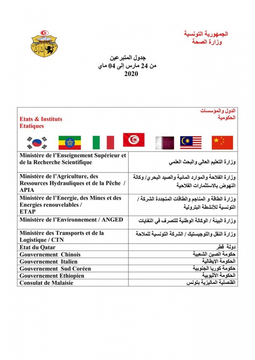 قائمة المتبرّعات والمتبرّعين في الفترة الممتدّة بين 24 مارس و04 ماي 2020 لفائدة الهياكل الصحيّة العمومية