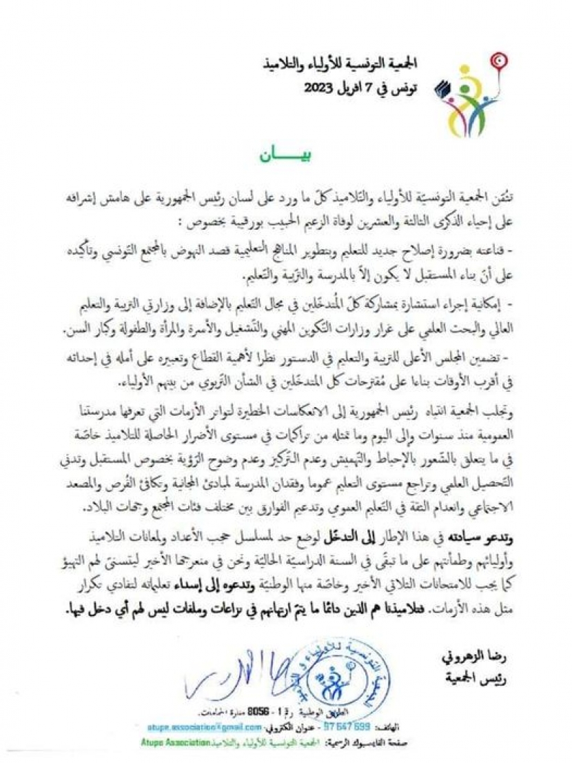 تثُمّن الجمعية التونسيّة للأولياء والتّلاميذ كلّ ما ورد على لسان رئيس الجمهورية على هامش إشرافه على إحياء الذّكرى الثالثة والعشرين لوفاة الزعيم الحبيب بورقيبة بخصوص :