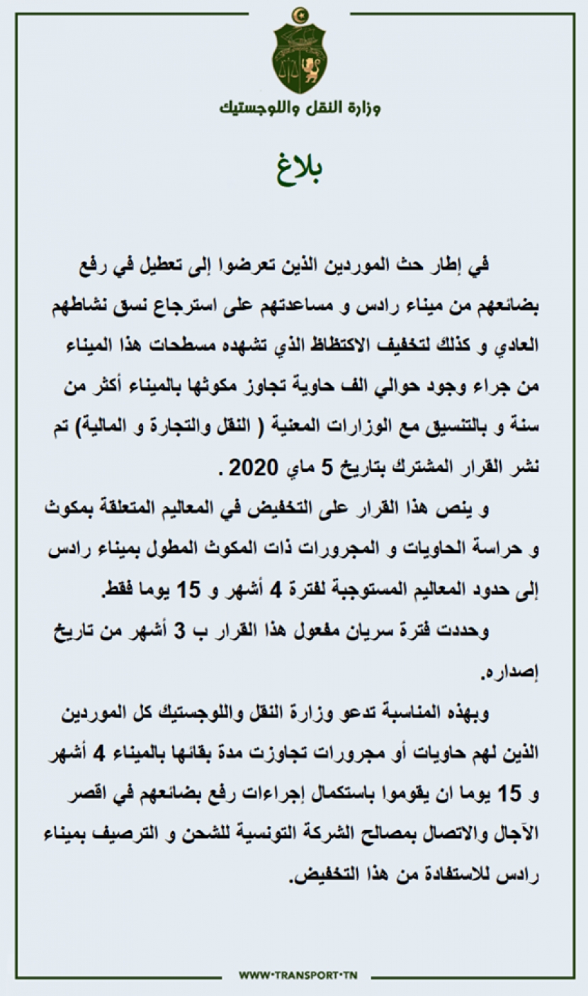 في إطار حث الموردين الذين تعرضوا إلى تعطيل في رفع بضائعهم من ميناء رادس و مساعدتهم على استرجاع نسق نشاطهم العادي و كذلك لتخفيف الاكتظاظ الذي تشهده مسطحات هذا الميناء من جراء وجود حوالي الف حاوية تجاوز مكوثها بالميناء أكثر من سنة و بالتنسيق مع الوزارات المعنية ( النقل والتجارة و المالية) تم نشر القرار المشترك بتاريخ 5 ماي 2020 بالرائد الرسمي عدد40 الصادر بتاريخ الجمعة 8ماي 2020 .