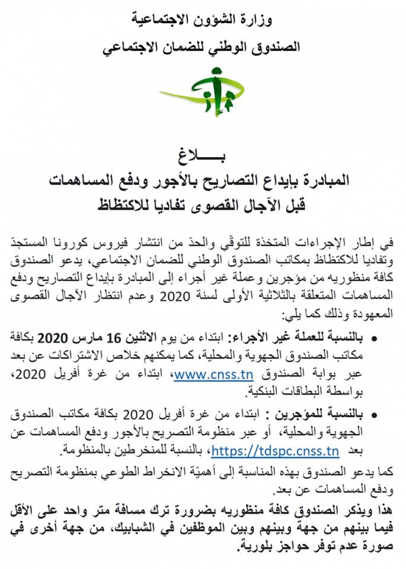 في إطار الإجراءات المتخذة للتوقّي والحدّ من انتشار فيروس كورونا المستجدّ وتفاديا للاكتظاظ بمكاتب الصندوق الوطني للضمان الاجتماعي، يدعو الصندوق كافة منظوريه من مؤجرين وعملة غير أجراء إلى المبادرة بإيداع التصاريح ودفع المساهمات المتعلقة بالثلاثية الأولى لسنة 2020 وعدم انتظار الآجال القصوى المعهودة وذلك كما يلي: