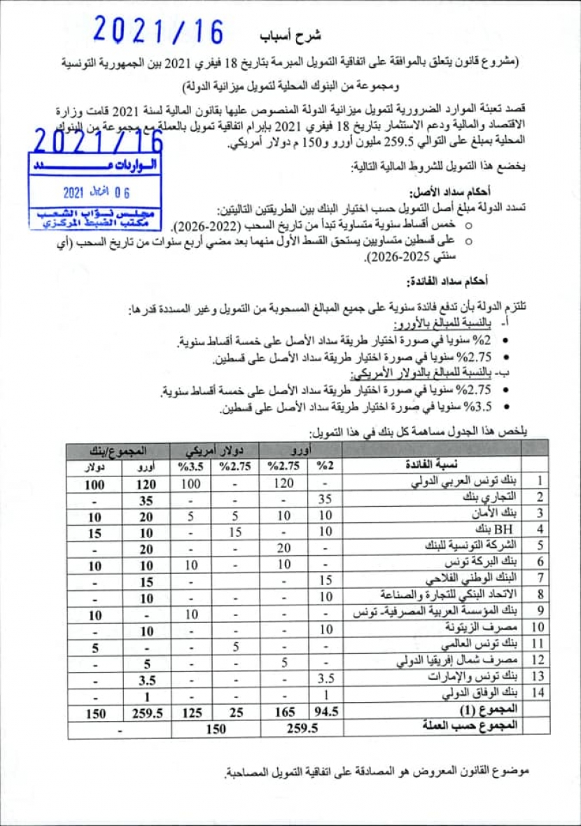 صادق مجلس نواب الشعب خلال الجلسة العامة ليوم الثلاثاء 18 ماي 2021 على مشروع القانون عدد 16/2021 المتعلق بالموافقة على اتفاقية التمويل المبرمة بتاريخ 18 فيفري 2021 بين الجمهورية التونسية وعدد من البنوك المحلية لتمويل ميزانية الدولة بمبلغ مائتان وتسعة وخمسون مليون وخمسمائة ألف أورو ومائة وخمسون مليون دولار أمريكي وذلك بـــــ 89 نعم، 32 احتفاظ و 10 رفض.
