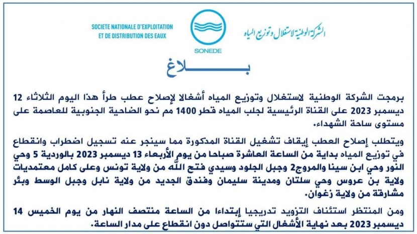 وأوضحت "الصوناد" أن انقطاع المياه يعود إلى برمجة أشغال لإصلاح عطب طرأ اليوم الثلاثاء 12 ديسمبر 2023 على القناة الرئيسية لجلب المياه قطر1400 مم نحو الضاحية الجنوبية للعاصمة على مستوى ساحة الشهداء.