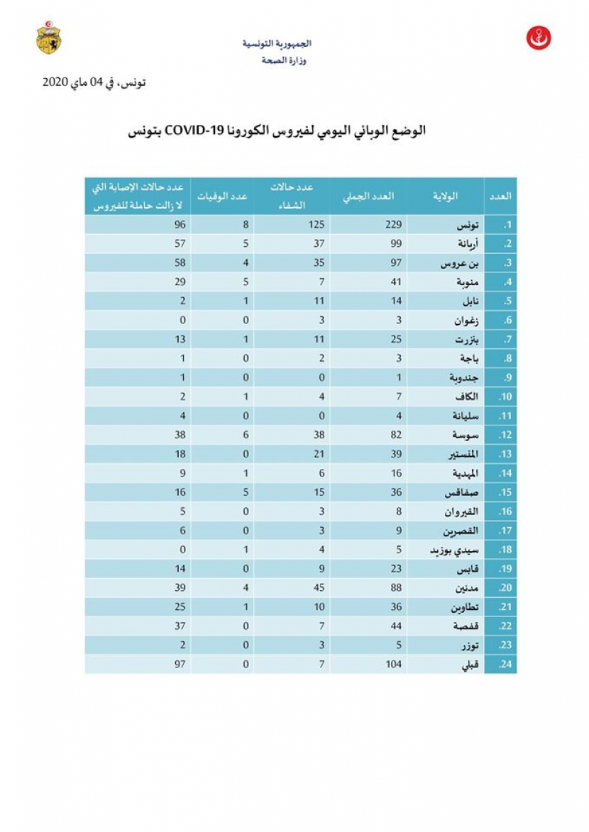 تعلم وزارة الصحة أنه بتاريخ 03 ماي 2020، تم إجراء 447 تحليلا مخبريا، من بينها 114 تحليلا في إطار متابعة المرضى السابقين ليبلغ العدد الجملي للتحاليل 24853 تحليلا.