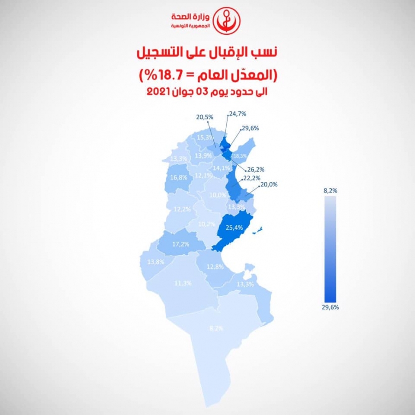 وتجدر الاشارة الى ان المعدّل العام للمطعّمين بالجرعة الاولى بلغ 33,1 % من المسجلين، فيما بلغت نسبة المطعّمين بالجرعة الاولى في الشريحة العمرية 75 سنة فما فوق 75,5 % وبلغت نسبة المطعّمين بالجرعة الاولى من المسجلين في فئة 60-74 سنة 72,8 بالمائة وبلغت نسبة المطعمين في الفئة العمرية 50-60 سنة 17,2 % بتاريخ 03 جوان 2021.