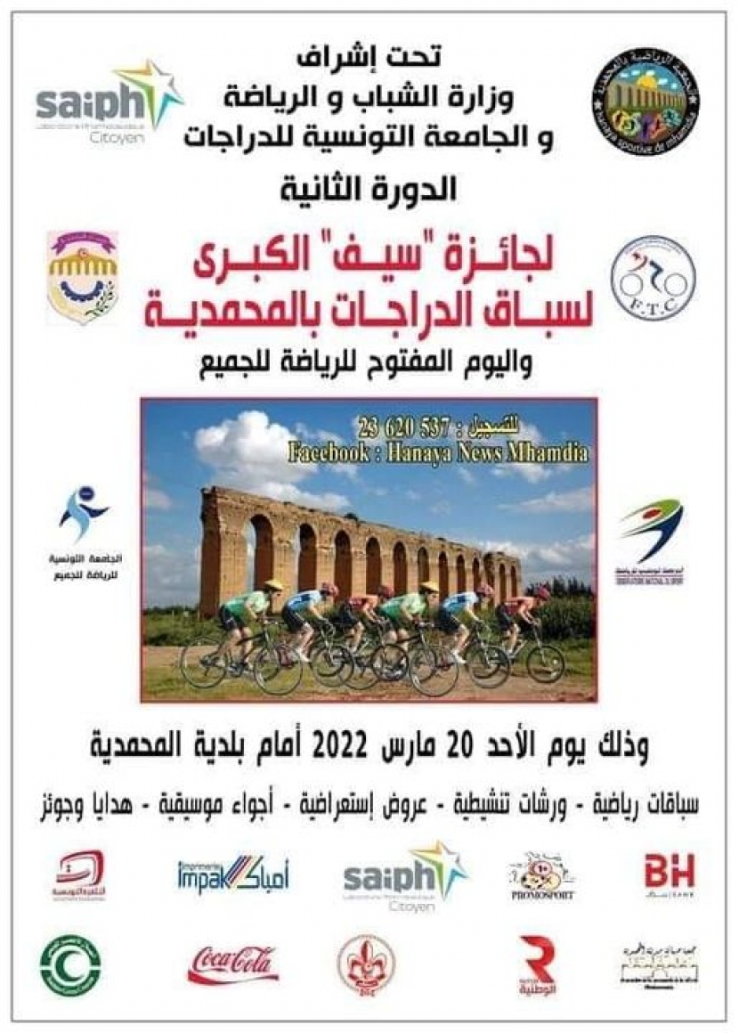 تنظم جمعية الحنايا الرياضية بالمحمدية وتحت اشراف الجامعة التونسية للدراجات والمرصد الوطني الرياضة وذلك يوم الاحد 20مارس 2022انطلاقا من الساعة 9صباحا امام بلدية المحمدية