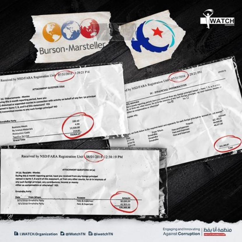 بالإضافة إلى إمضائها على عقدي لوبيينق -Lobbying- قبيل انتخابات 2014 و2019، قامت حركة النهضة بإمضاء عقدين آخرين مع شركة Burson-Marsteller الأمريكية وذلك قبيل مؤتمرها العاشر سنة 2016 وقبيل الانتخابات البلدية لسنة 2018. وتبلغ قيمة العقدين المذكورين حوالي 355,850.79 دولار أي ما يعادل المليون دينار تونسي.