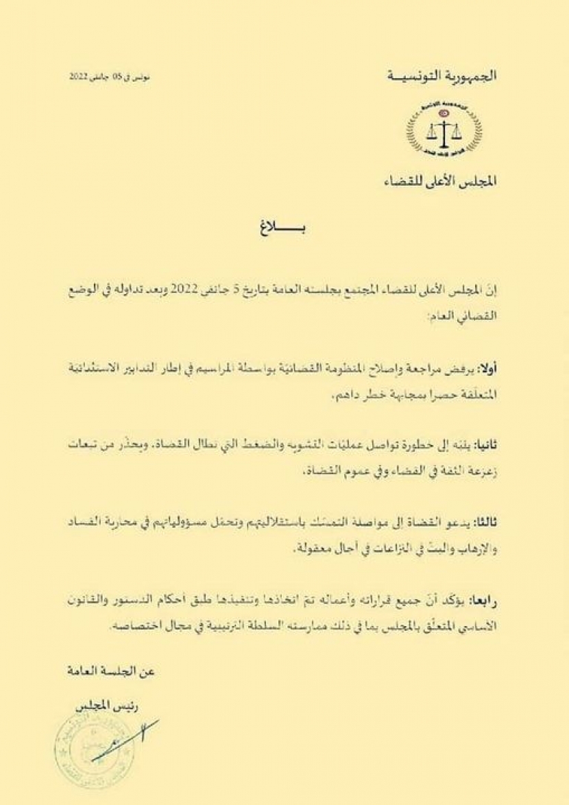 ونبّه المجلس إلى ''خطورة تواصل عمليات التشويه والضغط التي تطال القضاة''، محذّرا من تبعات زعزعة الثقة في القضاء وفي عموم القضاة، حسب نصّ البيان.
