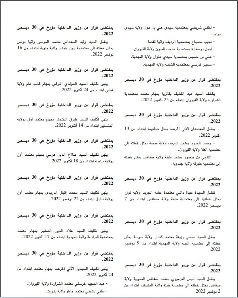 صدر بالرائد الرسمي للجمهورية التونسية في نسخته الأخيرة مساء الجمعة 30 ديسمبر 2022 قرار من وزير الداخلية مؤرخ في 30 ديسمبر ويقضي بتسمية معتمدين في جهات مختلفة.