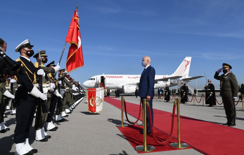 ولدى حلوله بمطار تونس قرطاج الدولي استعرض رئيس الجمهورية تشكيلة من الجيوش الثلاثة أدت له التحية، قبل تحية العلم على أنغام النشيد الوطني.