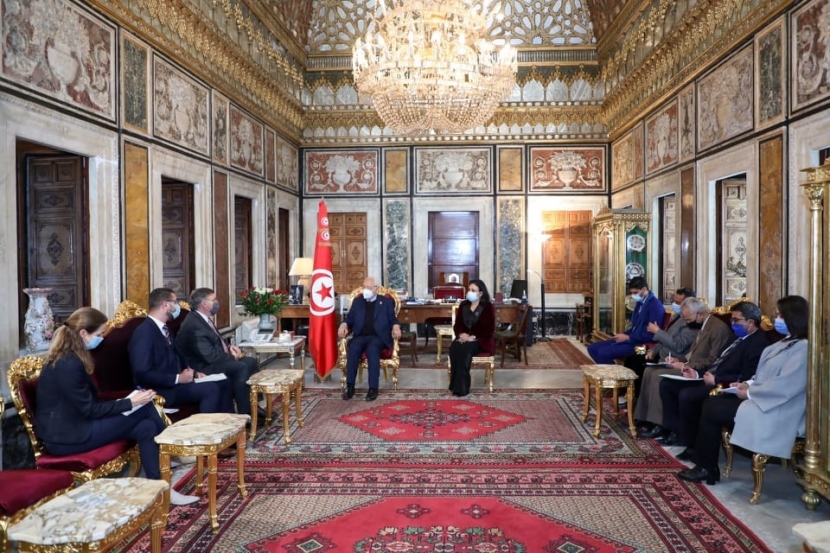 ? استقبل الأستاذ راشد خريجي الغنوشي رئيس مجلس نواب الشعب صباح اليوم الثلاثاء 23 فيفري 2021 بقصر باردو السيد Blome Donald Armin، سفير الولايات المتحدة الامريكية بتونس، بحضور السيدة سماح دمق رئيسة لجنة الحقوق والحريات والعلاقات الخارجية .