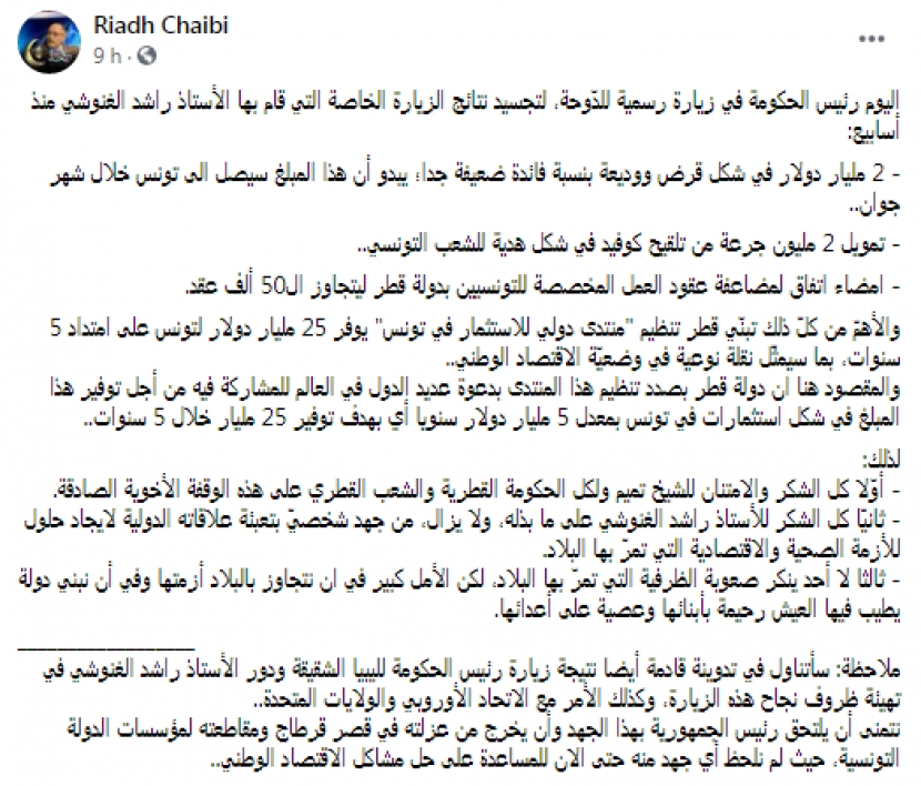 اعتبر رياض الشعيبي المستشار السياسي لرئيس حركة النهضة راشد الغنوشي أنّ الزيارة التي شرع في تأديتها رئيس الحكومة هشام المشيشي إلى قطر،ولم تعلن عنها رئاسة الحكومة، جاءت "لتجسيد نتائج الزيارة الخاصة " التي قام بها الغنوشي مؤخرا.