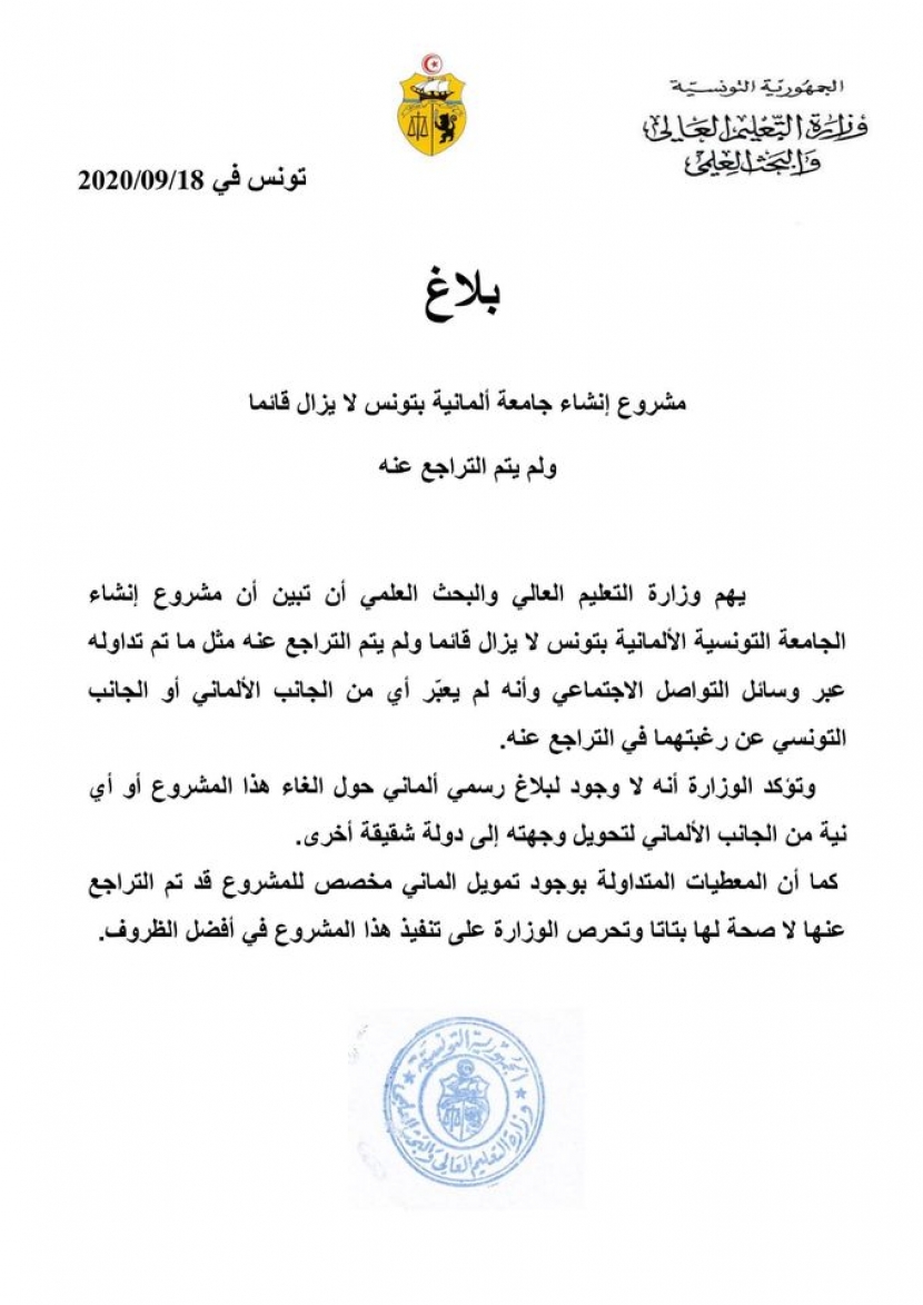 أعلنت وزارة التعليم العالي والبحث العلمي، اليوم الجمعة، أنه قد تبين أن مشروع إنشاء الجامعة التونسية الألمانية بتونس ما يزال قائما ولم يتم التراجع عنه مثل ما تم تداوله عبر وسائل التواصل الإجتماعي.