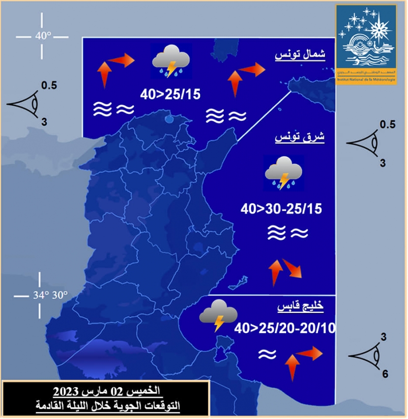 والأجواء باردة نسبيا، إذ تتراوح الحرارة ليلا بين 10 و15 درجة بالمناطق الساحلية والجنوب وبين 4 و9 درجات ببقية الجهات.