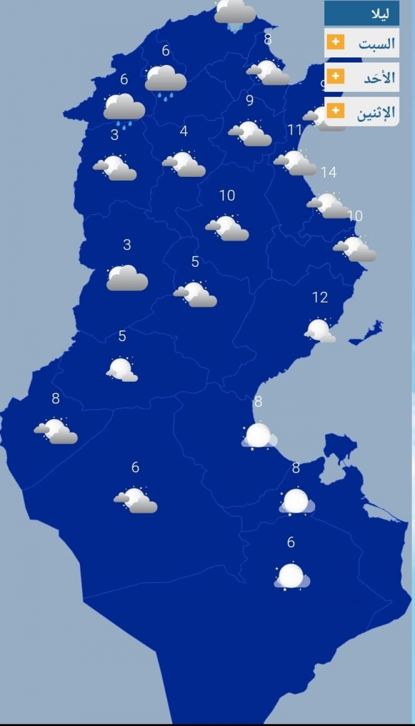 طقس بارد خلال الليلة بأغلب الجهات ومن المنتظر أن تتراوح الحرارة ليلا بين 3 و8 درجات بإستثناء السواحل الشرقية حيث تكون بين 9 و14 درجة..