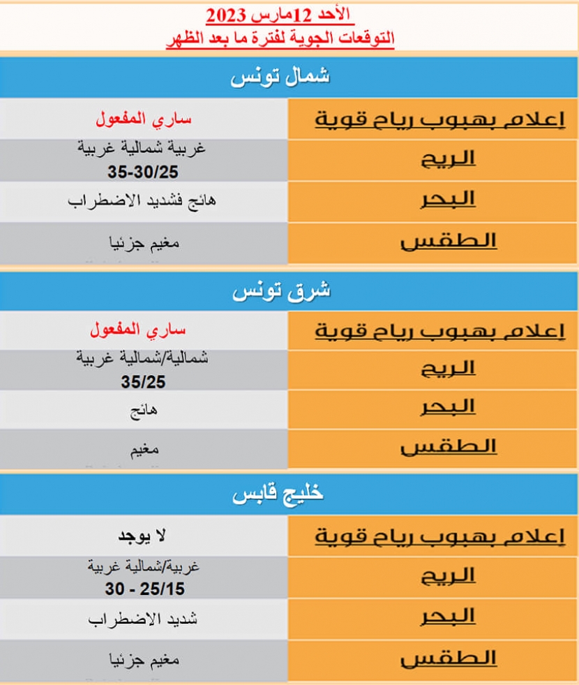 شدة الرياح متواصلة قرب السواحل الشمالية وبالمناطق الجبلية الغربية.. النشرات التحذيرية سارية المفعول بالنسبة للملاحة والصيد البحري والبحر شديد الاضطراب إلى هائج بالشمال و متموج ببقيّة المجالات البحرية..
