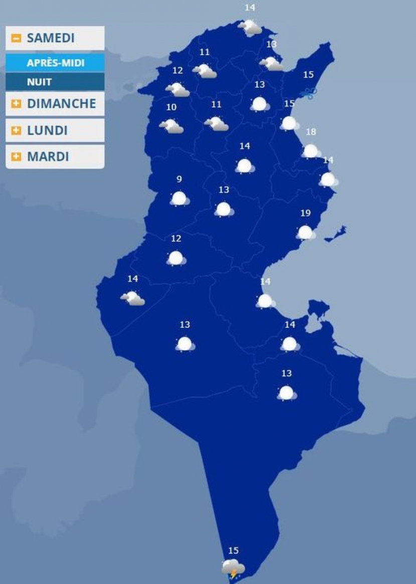 ومع درجات حرارة ليلية تتراوح بين 11 و 18 درجة وتكون في حدود 9 درجات بالمرتفعات الغربية، وأما عنصر الرياح خلال هذه الليلة يتطلب نصيب من الحذر حيث تكون سرعتها قوية قرب السواحل الشمالية، وهناك نشرات تحذيرية بالنسبة للملاحة و الصيد البحري تهمّ منطقة سرات و خليج تونس، و تكون سرعتها معتدلة ببقية الجهات..