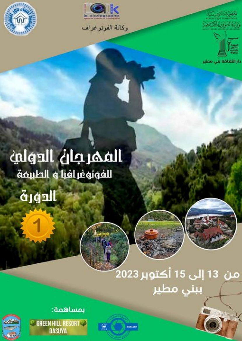 في اطار مساهمتها في بعث تظاهرات ثقافية قارّة وذات أهداف خصوصية بما يخدم السياحة الثقافية والبيئية لجهة بني مطير وبما يساهم في التنمية المحلية والدورة الاقتصادية وتحت اشراف وزارة الشؤون الثقافية وبدعم منها تنظّم جمعية أحبّاء دور الثقافة التي يرأسها الاستاذ منصف كريمي بالشراكة مع المندوبية الجهوية للشؤون الثقافية بجندوبة ودار الثقافة بني مطير ووكالة"فوتوغرافيا"فعاليات الدورة الاولى لـ"المهرجان الدولي للفوتوغرافيا والطبيعة"وذلك من 13 الى 15 أكتوبر الجاري وبمشاركة عدد من الفوتوغرافيين من تونس ومن ايطاليا،العراق،الجزائر ومصر