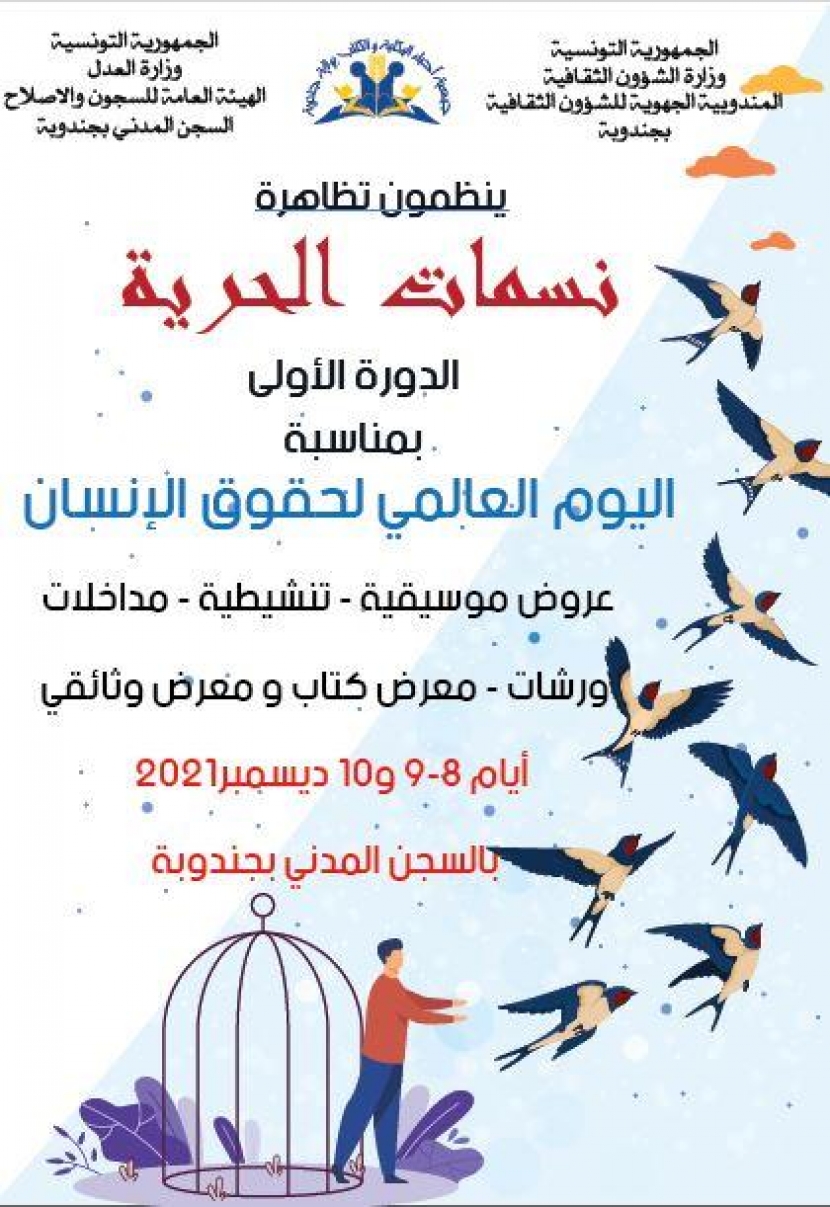 حرصا منها على تنظيم تظاهرات تأسيسية ذات خصوصية وفي اطار الاحتفال باليوم العالمي لحقوق الانسان وتفعيلا للشراكات الثقافية تنظّم المندوبية الجهوية للشؤون الثقافية بجندوبة وفي تنسيق من الاستاذة ثريا الحبيب وبالتعاون والشراكة مع كل من ادارة السجن المدني ببلاريجيا وجمعية أحبّاء المكتبة والكتاب بولاية جندوبة التي تشرف على رئاستها مفيدة غزواني فعاليات الدورة التأسيسية الاولى لتظاهرة"نسمات الحرية"وذلك من 8 الى 10 ديسمبر الجاري