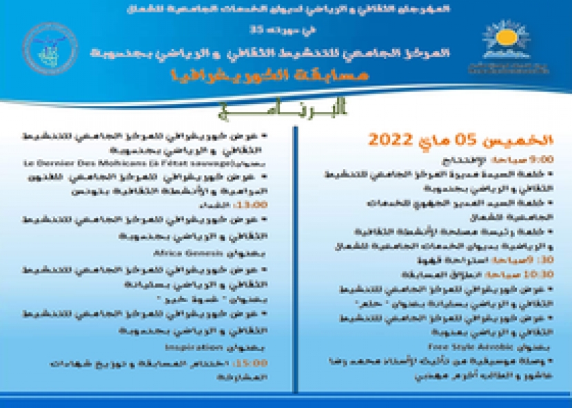 وتفتتح هذه التظاهرة بكلمة مديرة المركز الجامعي للتنشيط الثقافي والرياضي بجندوبة فكلمة المدير الجهوي للخدمات الجامعية للشمال فكلمة رئيسة مصلحة الانشطة الثقافية والرياضية بديوان الخدمات الجامعية للشمال ثم تنطلق المسابقة بعرض كوريغرافي بعنوان"حلم"من انتاج المركز الجامعي للتنشيط الثقافي والرياضي بسليانة فعرض بعنوان"free style aérobic "من انتاج المركز الجامعي للتنشيط الثقافي والرياضي بمنوبة فوصلة موسيقية من تأثيث الاستاط محمد رضا عاشور والطالب أكرم مهذبي ثم يقدّم عرض كوريغرافي بعنوان"le dernier des mohicans a’ l’état sauvage"من انتاج المركز الجامعي للتنشيط الثقافي والرياضي بجندوبة فتقديم عرض كوريغرافي آخر من انتاج المركز الجامعي للفنون الدرامية والتنشيط الثقافي بتونس