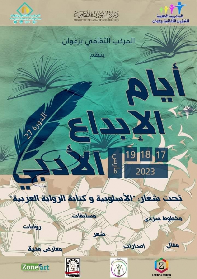 باشراف ودعم من المندوبية الجهوية للشؤون الثقافية بزغوان وتحت شعار " الأسلوبية و كتابة الرواية العربية" ومن  17الى 19 مارس الجاري ينظّم المركّب الثقافي بزغوان الذي يشرف على ادارته الاستاذ بلال بوهريرة فعاليات الدورة 27 لأيام الإبداع الأدبي