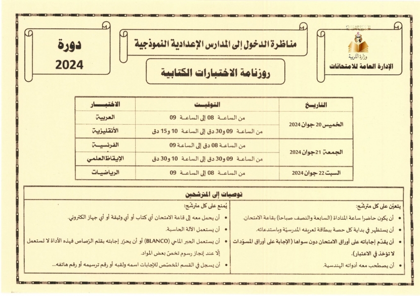 وحددت الوزارة رزنامة الاختبارات الكتابية لمناظرة الدخول إلى المدارس الإعدادية النموذجية من 20 إلى 22 جوان القادم.