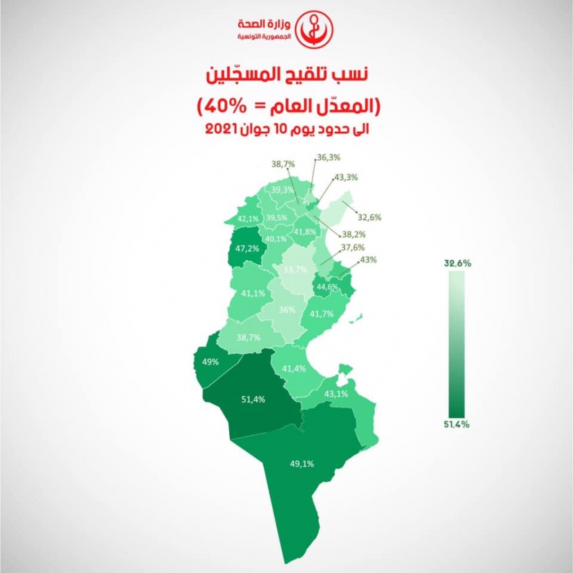 وتجدر الاشارة الى ان المعدّل العام للمطعّمين بالجرعة الاولى بلغ 40 % من المسجلين، فيما بلغت نسبة المطعّمين بالجرعة الاولى في الشريحة العمرية 75 سنة فما فوق 76,6 % وبلغت نسبة المطعّمين بالجرعة الاولى من المسجلين في فئة 60-74 سنة 74,5 بالمائة وبلغت نسبة المطعمين في الفئة العمرية 50-60 سنة 46,2 % بتاريخ 11 جوان 2021.