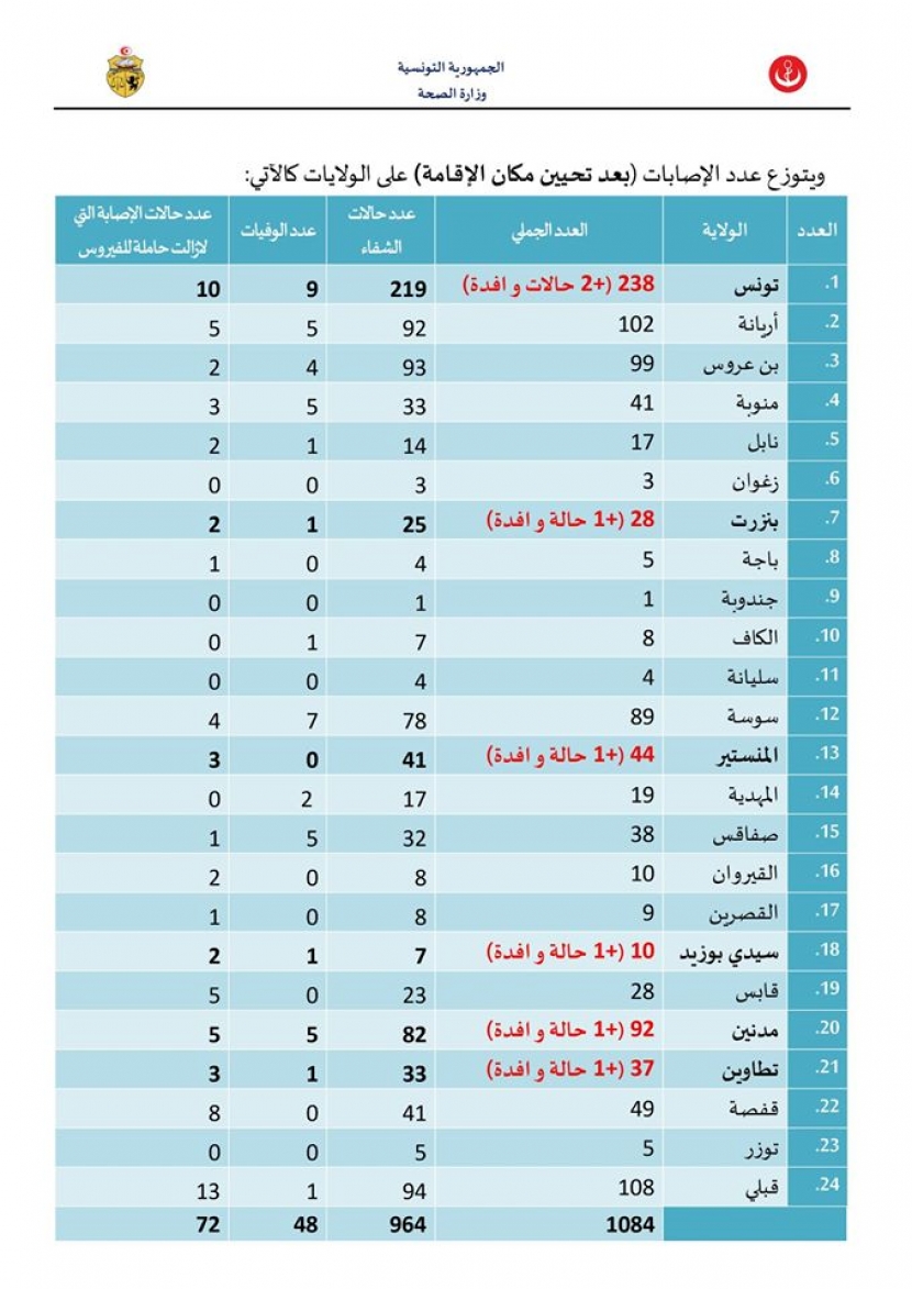 وقد تم تسجيل 08 تحاليل إيجابية، 01 منها لحالة إصابة سابقة لا تزال حاملة للفيروس و07 حالات إصابة جديدة وافدة من ضمن الذين تم إجلاؤهم ووضعهم في مراكز الحجر الصحي الإجباري، ليبلغ العدد الجملي للمصابين بهذا الفيروس، وذلك بعد التثبت من المعطيات وتحيينها 1084 حالة مؤكدة موزعة كالآتي: 964 حالة شفاء و48 حالة وفاة (لم يتم تسجيل حالات وفاة جديدة) و72 حالة إصابة لا تزال حاملة للفيروس وهي بصدد المتابعة من بينها 2 مقيمين حاليا في المستشفيات.