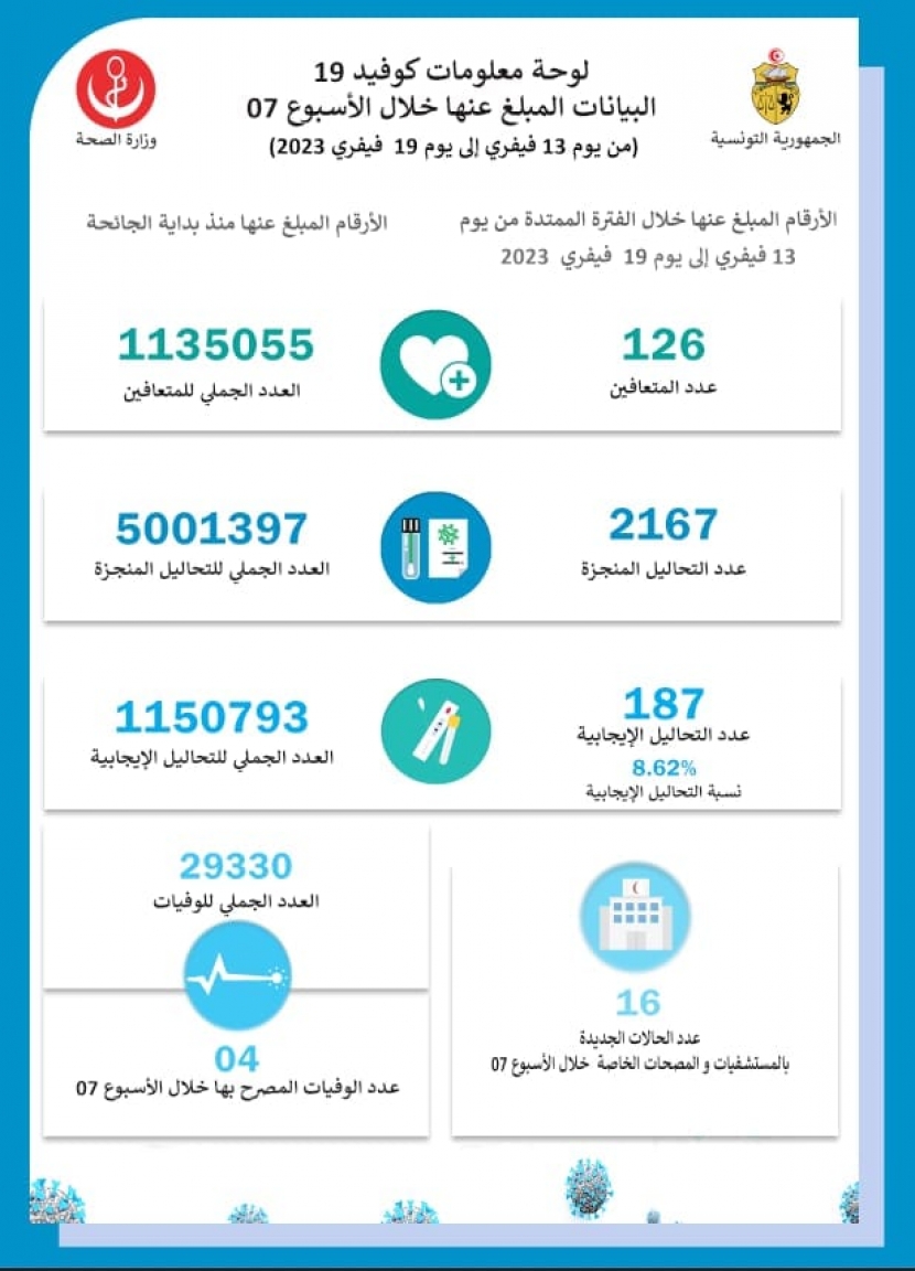 jasminsnews - كورونا :الأرقام الرئيسيّة المسجّلة خلال الأسبوع (من يوم 13 فيفري 2023 إلى يوم 19 فيفري 2023)