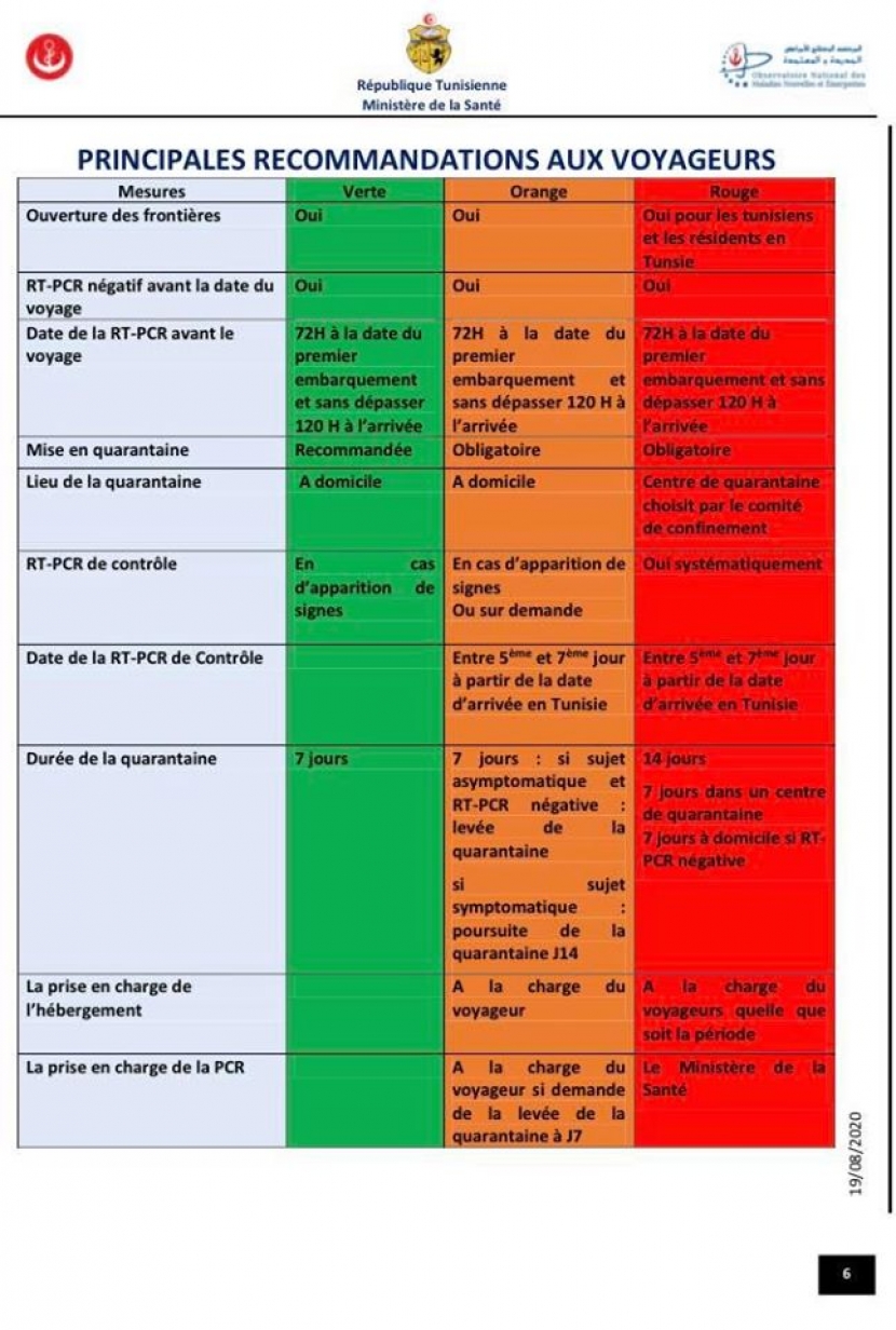 أصدرت وزارة الصحة اليوم الأربعاء 19 أوت 2020، التصنيف الجديد للدول حسب وضعها الوبائي، وقد بقيت إيطاليا ضمن الدول الخضراء، وبقيت كل من فرنسا وألمانيا في القائمة البرتقالية، في حين تم تصنيف ايزلندا برتقالية بعد أن كانت حمراء.