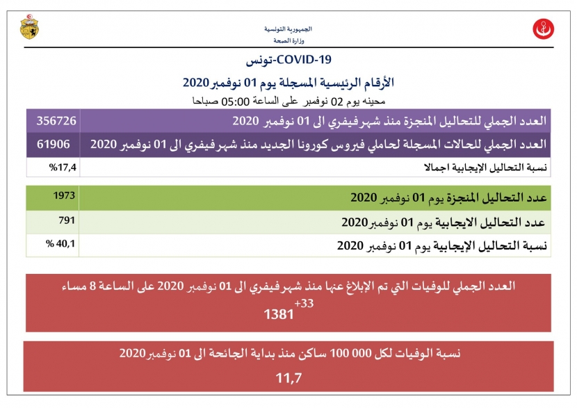 مستجدات الوضع الوبائي في تونس الى يوم 01 نوفمبر 2020