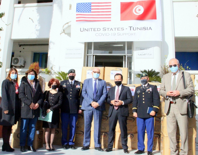 كما انتظم على هامش هذا اللقاء موكب تمّ خلاله تسليم هبة من الولايات المتحدة الأمريكية تشتمل على كميات هامة من مستلزمات الحماية الفردية لفائدة مهنيي الصحة مخصصة لكل من المستشفى الجهوي ببن قردان والمستشفى المحلي برمادة وتعدّ هذه الهبة القسط الأخير من إجمالي المساعدات التي قدمتها الحكومة الأمريكية لدعم جهود تونس في مجابهة جائحة كوفيد-19 منذ مارس 2020 والتي فاقت قيمتها 36 مليون دولار.
