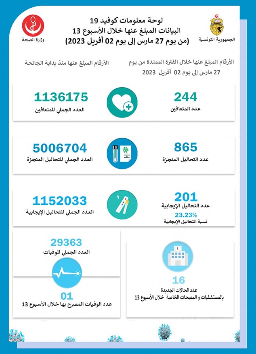 jasminsnews - وزارة الصحة: تسجيل وفاة و 201 إصابة جديدة بفيروس كورونا خلال الأسبوع الممتد من 27 مارس إلى 2 أفريل الجاري