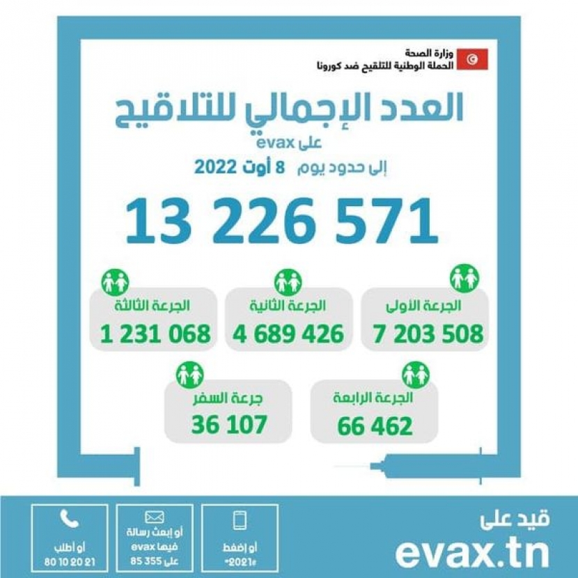وأضافت وزارة الصحة في بلاغها الدوري حول تقدم الحملة الوطنية للتلقيح ضد كورونا أن عدد الملقحين بالجرعة الثالثة بلغ 1.231.086 شخصا إلى حدود ذات التاريخ.وأضافت وزارة الصحة أن 6.380.359 شخصا استكملوا التلاقيح ضد كورونا، وذلك منذ انطلاق الحملة الوطنية للتلقيح ضد كورونا وإلى غاية 8 أوت الجاري.يشار الى أن تونس تسجل حاليا انخفاضا في مؤشرات الوضع الوبائي الوطني مقارنة بحالة الارتفاع التي شهدتها في بداية شهر جويلية الماضي.
