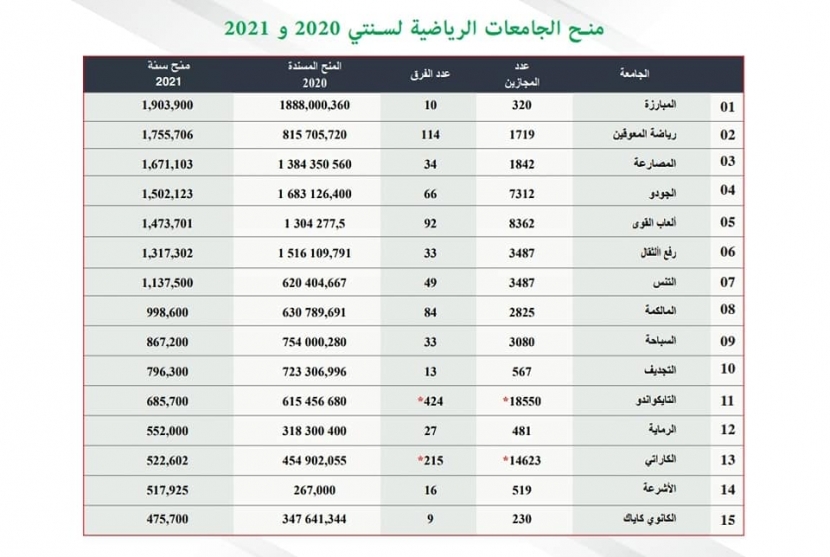 ♦️في إطار الشفافية يهم الوزارة نشر مبالغ المنح المسندة للجامعات الرياضية خلال سنة 2020 و المنح الخاصة بميزانية 2021 والتي تؤكد حصول الرياضات الفردية على 75% من جملة الإعتمادات المخصصة للجامعات الرياضية وحصول الرياضات الجماعية على نسبة 25 % ، ونشر عدد المجازين وعدد الجمعيات المنخرطة في مختلف الجامعات والمتوفرة بالادارة العامة للرياضة .