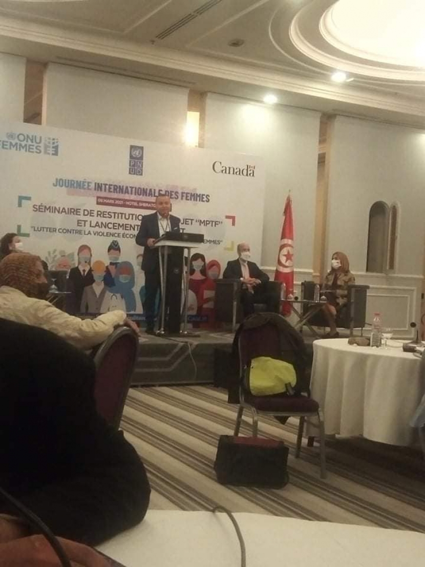 بمناسبة اليوم العالمي للنساء، نظمت هيئة الأمم المتحدة للمرأة ندوة اليوم الاثنين 08 مارس 2021 بنزل الشيراتون بالعاصمة لإطلاق مشروعها "مكافحة العنف الاقتصادي المسلط على النساء في تونس" بمشاركة وزيرة المرأة والأسرة والطفولة وكبار السن وسفير كندا بتونس ونائب الممثل المقيم لبرنامج الأمم المتحدة الإنمائي بتونس.