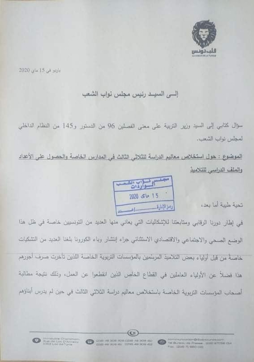 وجاء هذا التساؤل إثر ورود العديد من التشكيات خاصةً من قبل أولياء بعض التلاميذ المرسّمين بالمؤسسات التربوية الخاصة اللذين تأخرت صرف أجورهم هذا فضلاً عن الأولياء العاملين في القطاع الخاص الذين انقطعوا عن العمل، وذلك نتيجة مطالبة أصحاب المؤسسات التربوية الخاصة باستخلاص معاليم دراسة الثلاثي الثالث في حين لم يدرس أبناؤهم يوما واحدا ولم يتمتّعوا بأي خدمات تعليمية أو ترفيهيّة وذلك بمقتضى إقرار الحجر الصحي الشامل على كامل البلاد منذ 21 مارس الفارط وفق ما أفادت به مريم السعيدي في سؤالها لوزير التربية.