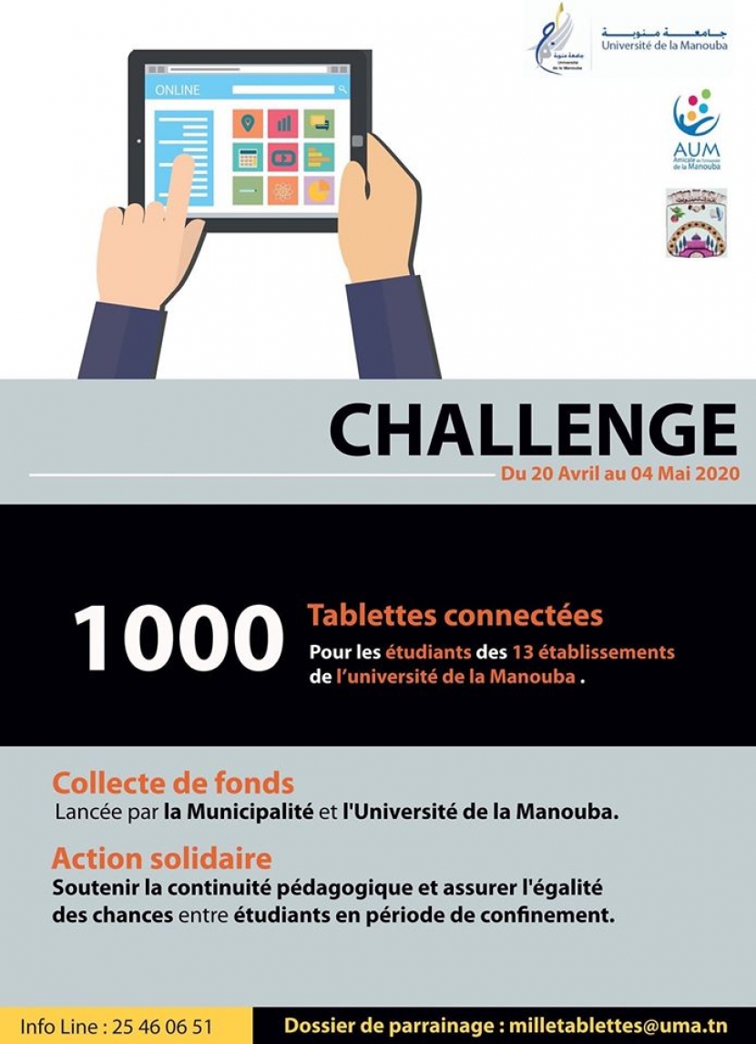 تخوض جامعة منوبة بالتعاون مع بلدية منوبة وووداية الجامعة وعدد كبير من المؤسسات الاقتصادية والتنموية تجربة جديدة في التضامن البيداغوجي والاجتماعي، وذلك بالاعلان عن تحدي 1000 لوح الكتروني موصول بالانترنات لفائدة طلبتها.